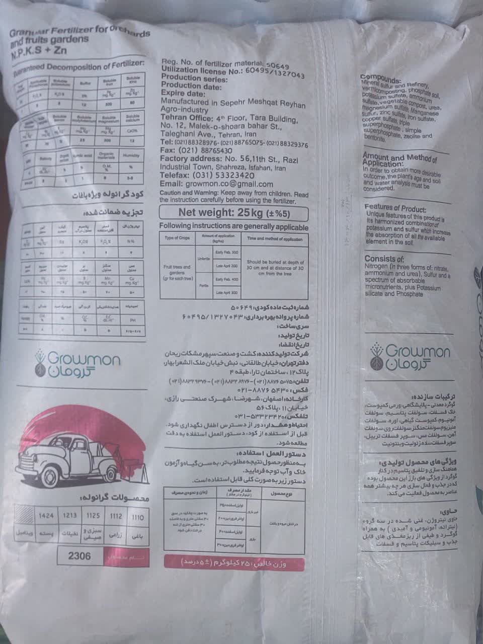 کود کامل گرانول ویژه باغات گرومان ترکیبی فوقالعاده از نیتروژن، فسفر ، پتاسیم و گوگرد به همراه ۸ عنصر غذایی ضروری دیگر است. این کود پیش کاشت با برخورداری از مواد هیومیکی و میزان قابل توجهی کربن آلی، در انواع خاکها از پایداری مناسب و قابلیت جذب مطلوبی برخوردار میباشد.